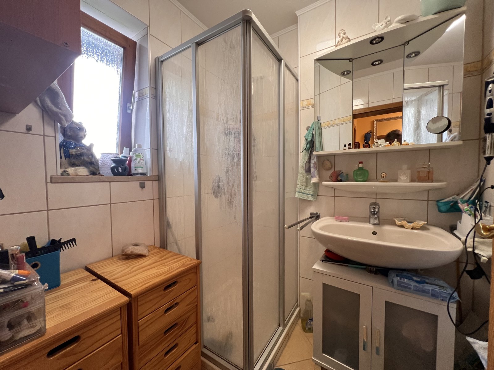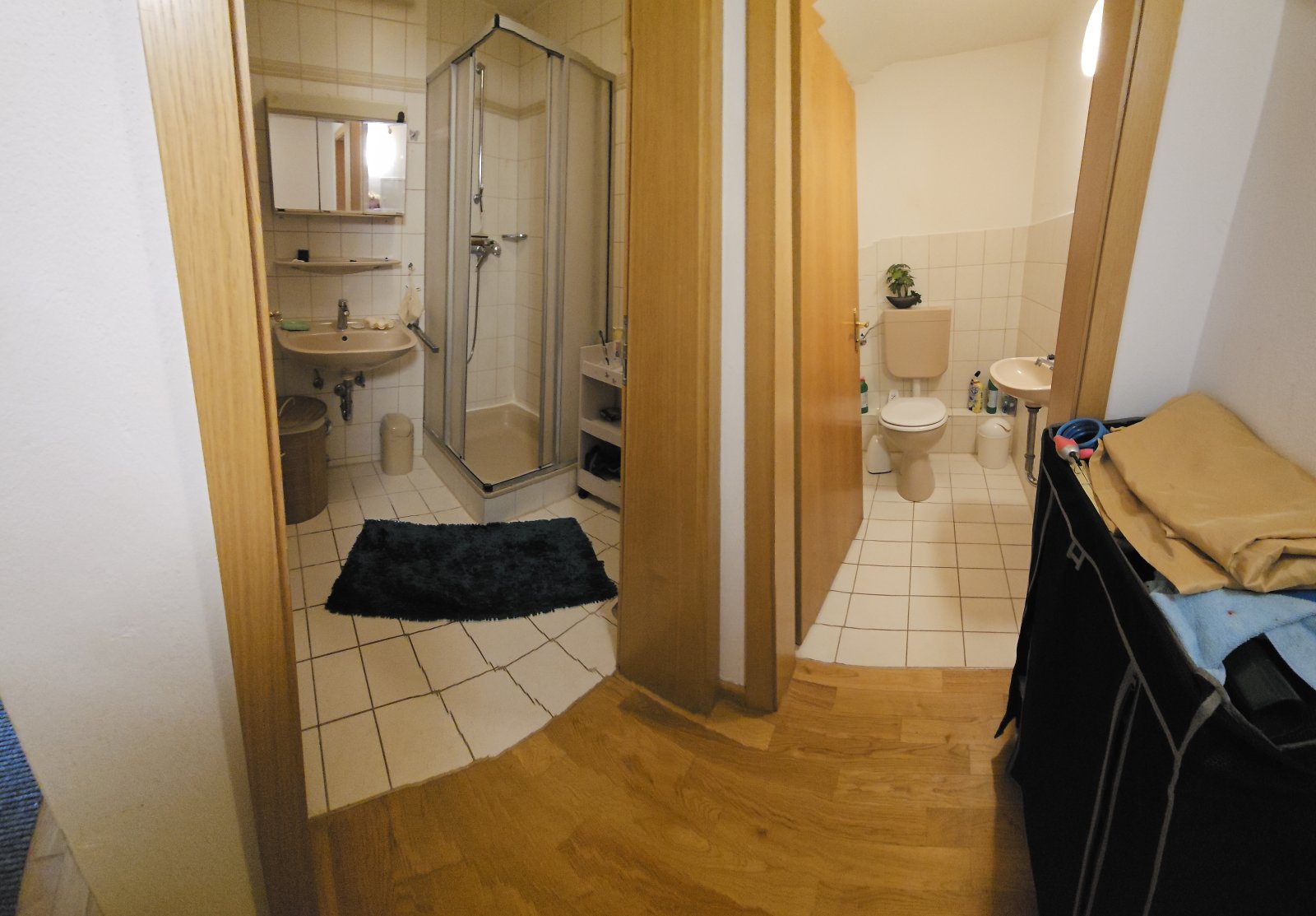 Das Badezimmer mit Dusche ist vom WC getrennt.
